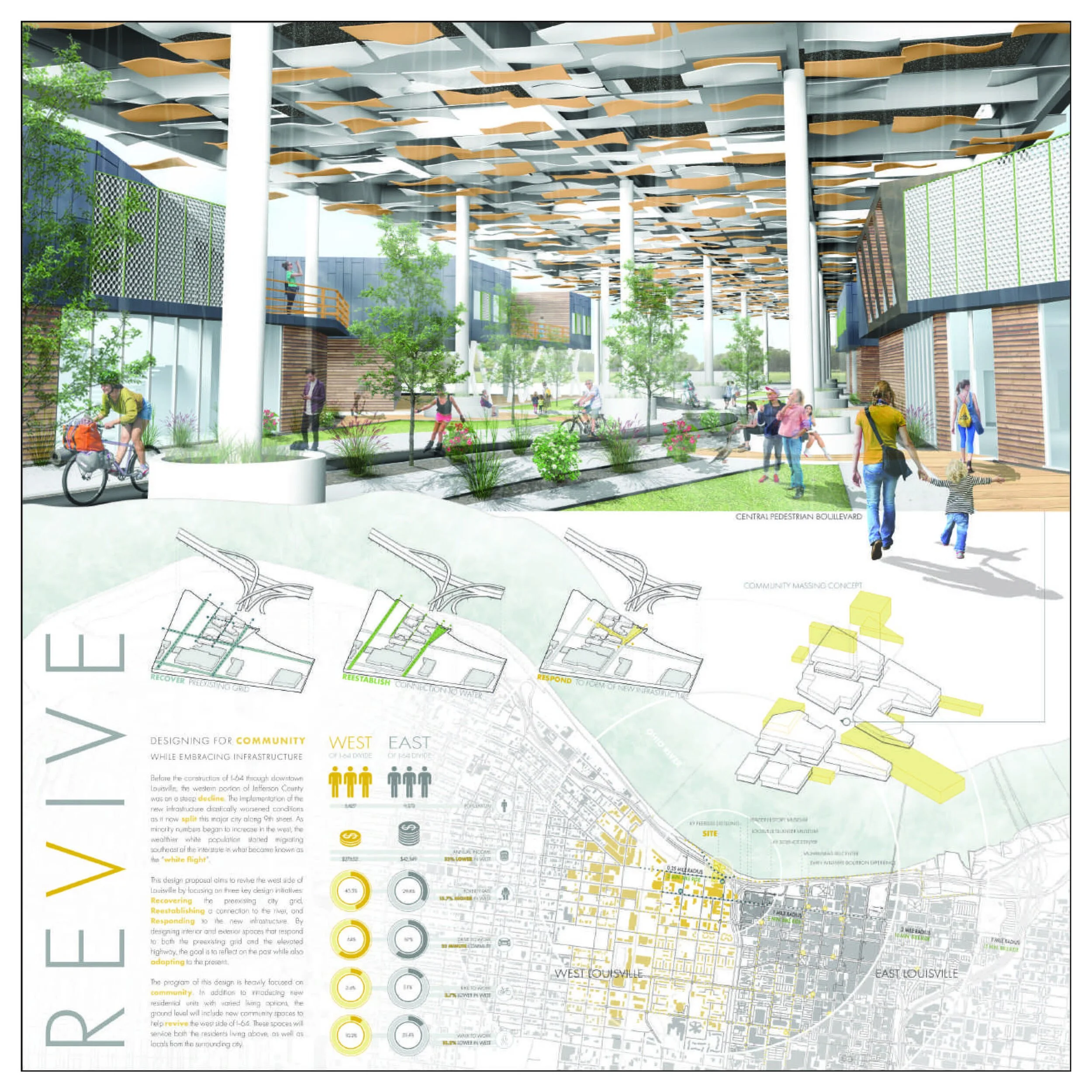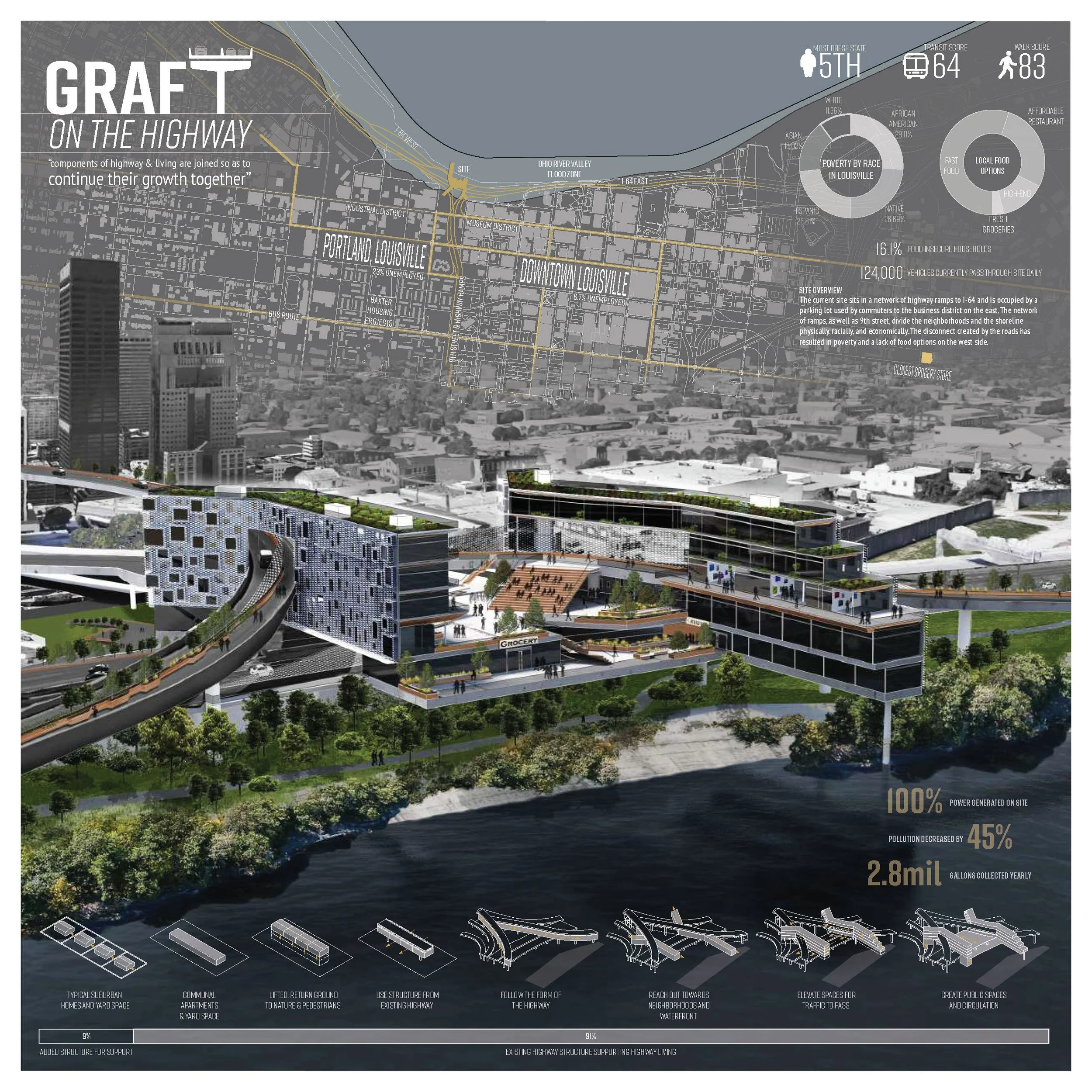 Located in Louisville, Kentucky, our proposal is located between the 9th street on and off ramps of Interstate-64. Historically, 9th street divides down-town Louisville from West Louisville, which houses the more industrial, sub-urban side of the city. This physical division of the city has also caused a demographic division amongst its citizens; with the predominantly affluent downtown Louisville separated from West Louisville, comprised of a lower income demographic, including 14% of the citizens of Louisville living in poverty. Our site is also located on a very active flood zone along the Ohio River. This has had great implications for the city of Louisville in terms of damage costs, flood prevention costs, and rebuilding efforts. Our proposal seeks to introduce an architectural solution to this flooding issue by elevating the construction above the existing flood wall (55 feet above sea level) and to pre-vent damages caused by future floods. Our elevated proposal also aims to reconnect a divided Louisville through a community plaza above the existing I-64 highway. The proposed 74,500 square foot plaza is nestled between two buildings totaling 87,700 of mixed-use program. 56,000 square feet of mixed demographic residential units (single family units, “community units” consisting of 4 rooms each with a shared common space and bathroom, and one-bedroom “studio” apartments that feature a commercial studio space) and a 31,700 square foot marketplace that houses a grocery store with fresh produce, food stands, local craftsmen merchandise, and art galleries. The marketplace has operable